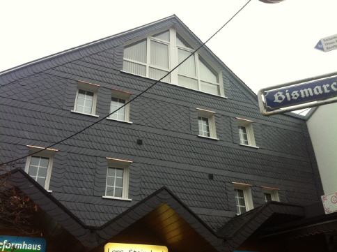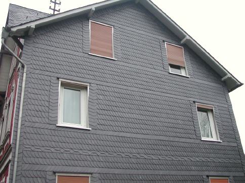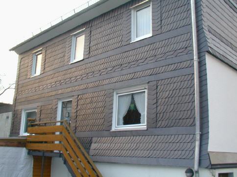 Vorgeschalte Wandfläche mit Schiefer, Format Schuppen 24 X 19 , in Schuppenschabloneneinfachdeckung , nach den Richtlinien für Deckungen mit Schiefer, fachgerecht eindecken. Befestigung pro Schiefer mit je 3 Stück verz. Schieferstiften 2.5 X 35 mm. Höhen-und Seitenüberdeckungen mind. 29 % der Steinhöhe mind jedoch 4 cm. Sonst nach den Richtlinien für Deckungen mit Schiefer, Fachregeln des Dachdeckerhandwerks. Orteindeckung als aufgelegte Orte, geschwungen zugerichtet, beinhaltet. Herkunftsland: Spanien Importeur: Rathsckeck Qualität und Grube: SIN 300 oder mind. gleichwertig. Eindeckung hier: Wand